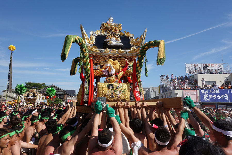灘のけんか祭りの屋台の原型といわれる木場屋台。木場港と刺繍された「幟」、幟に続く二十本の「お迎え提灯」、錦糸を太くねじった「金のねじ幕」、屋台の四隅で威勢よく揺れ動く「伊達綱」とその下の赤・緑・黄の「手綱」など、明らかに港を意識した祭りをしている。