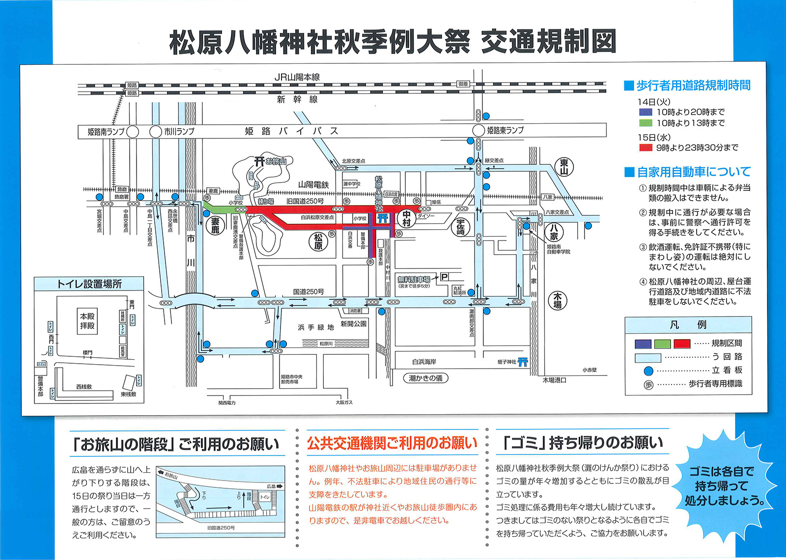 松原八幡神社・・・山陽電車・白浜の宮駅下車(祭り当日は直通特急・特急が臨時停車します)南へ徒歩5分駐車場等がないため、公共機関のご利用をお願いします。
