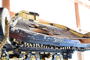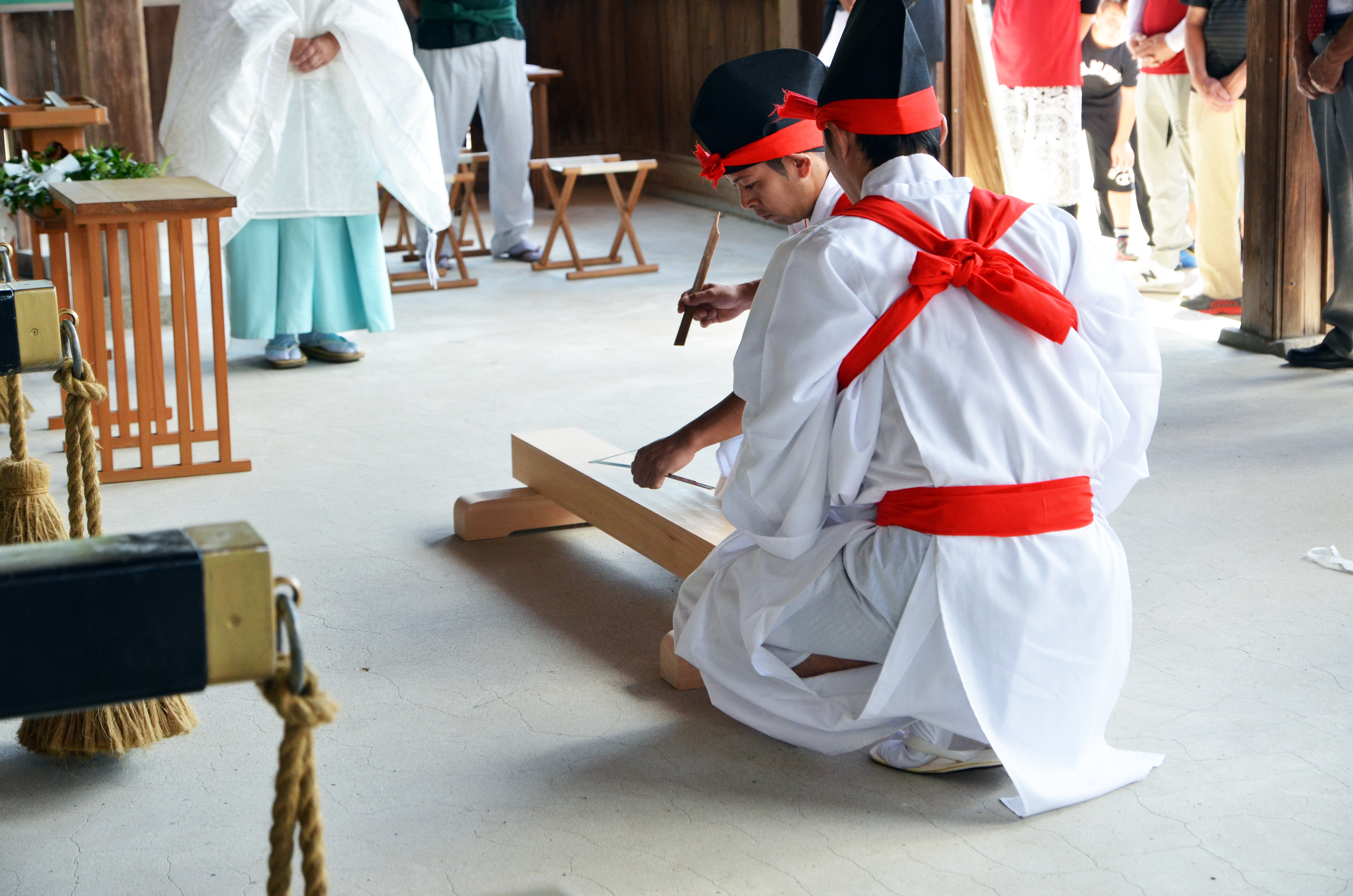 平成29年9月2日(日) 神輿修復の開始となる、神輿鑿入祭(のみいれさい)が年番「松原」の氏子により厳かに執り行われました。 晴天の下、松原の棟梁の手により、神輿丈量の儀、鑿立の神事が執り行われました。 これより3週間かけて、神輿の修復が始まります 鑿入祭に先立ち、神輿練り練習もおこなわれ、早くも祭り気分が盛り上がりました。 修復された神輿は、10月1日の奉据祭でお披露目されます。